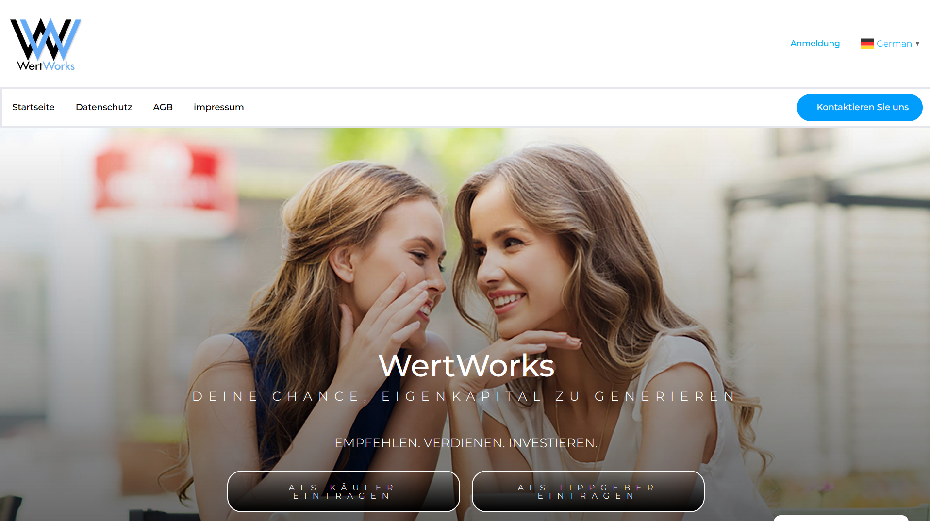 Die Website wertworks.de präsentiert sich als innovative Plattform im Immobilienbereich, die es Nutzern ermöglicht, durch Empfehlungen Eigenkapital für den Immobilienkauf aufzubauen. Das Geschäftsmodell basiert auf einem Tippgeber-Programm, bei dem Nutzer Immobilien empfehlen und dafür eine Tipp-Prämie erhalten. Ziel ist es, den Weg zum Eigenheim zu erleichtern, insbesondere für Erstkäufer.